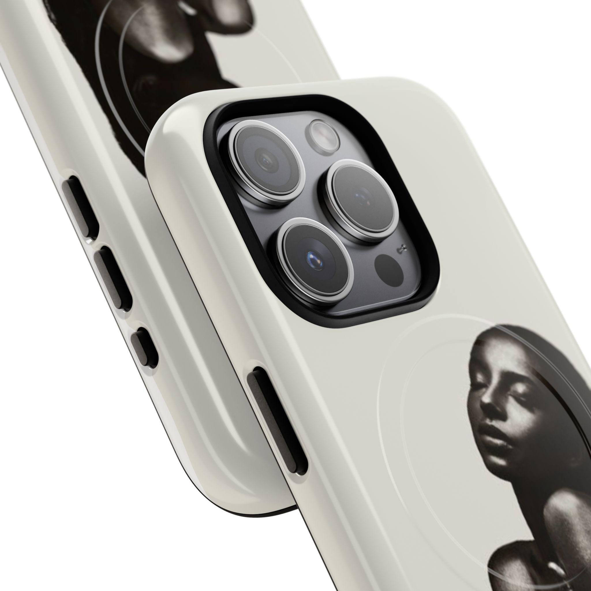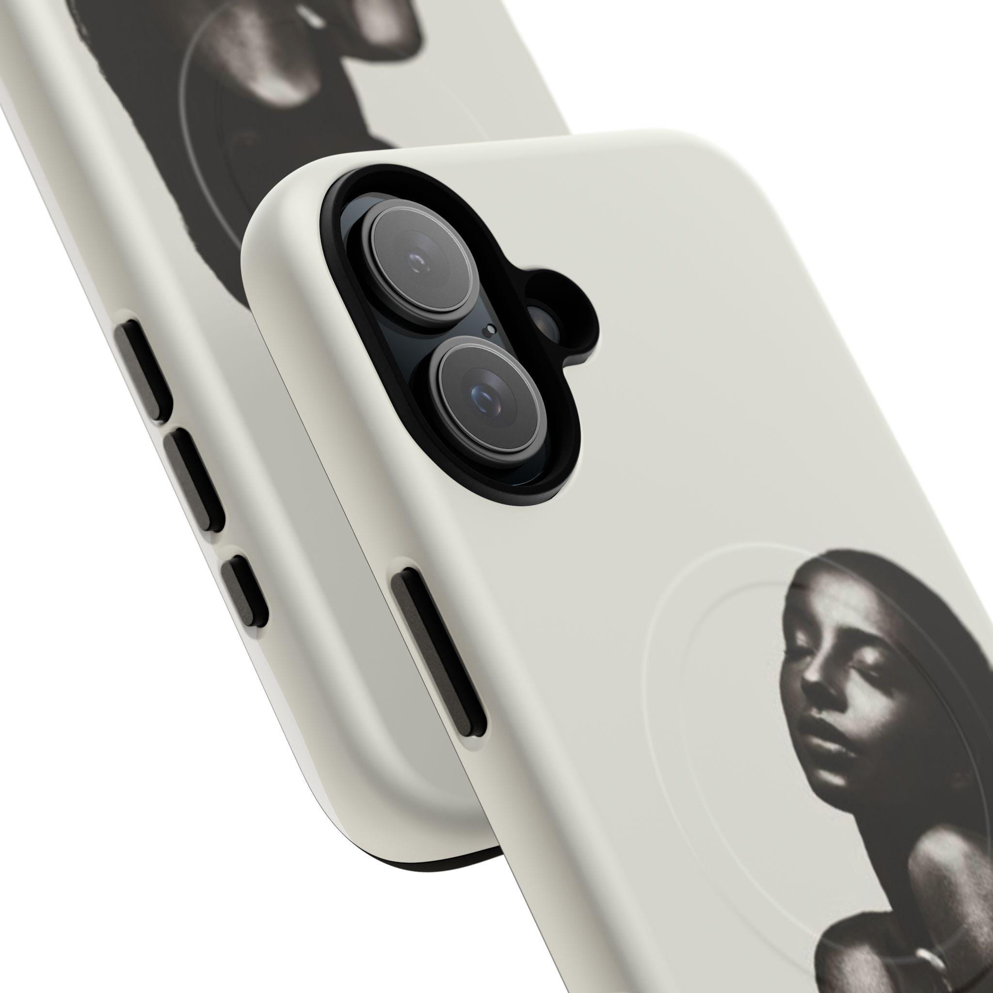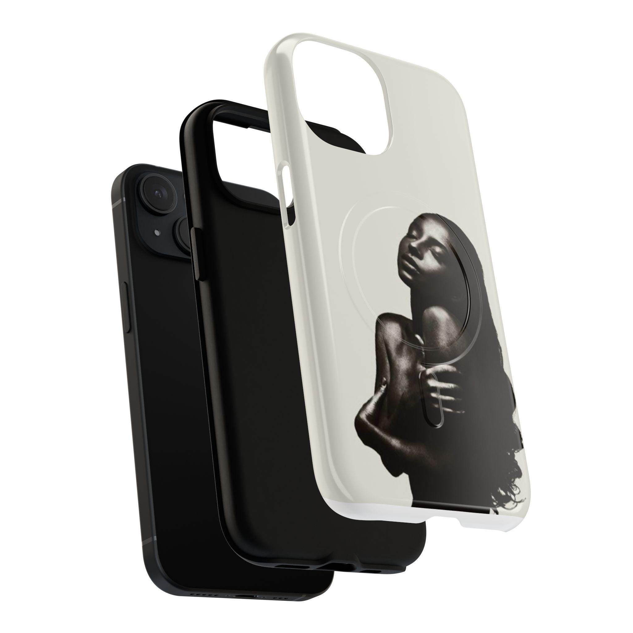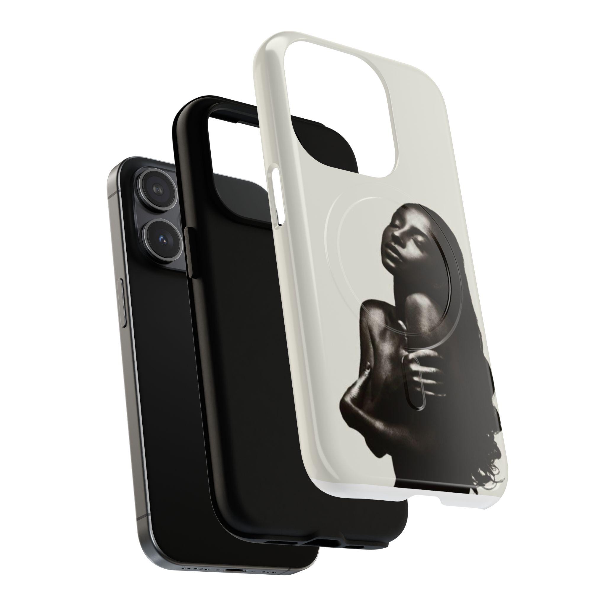 This slim, dual-layer phone case wraps your device in quiet confidence. A soft-touch silicone liner cushions every drop while the rigid polycarbonate shell shows off a monochrome portrait that reads like a moment captured in film — luminous highlights, deep shadows, and an intimate pose that draws the eye. The embedded magnetic module is MagSafe® compatible so the case works with chargers and accessories without losing its sleek profile. Finished in your choice of glossy or matte, with clear ports and precise cutouts, it’s made to live in your hands and travel with you.