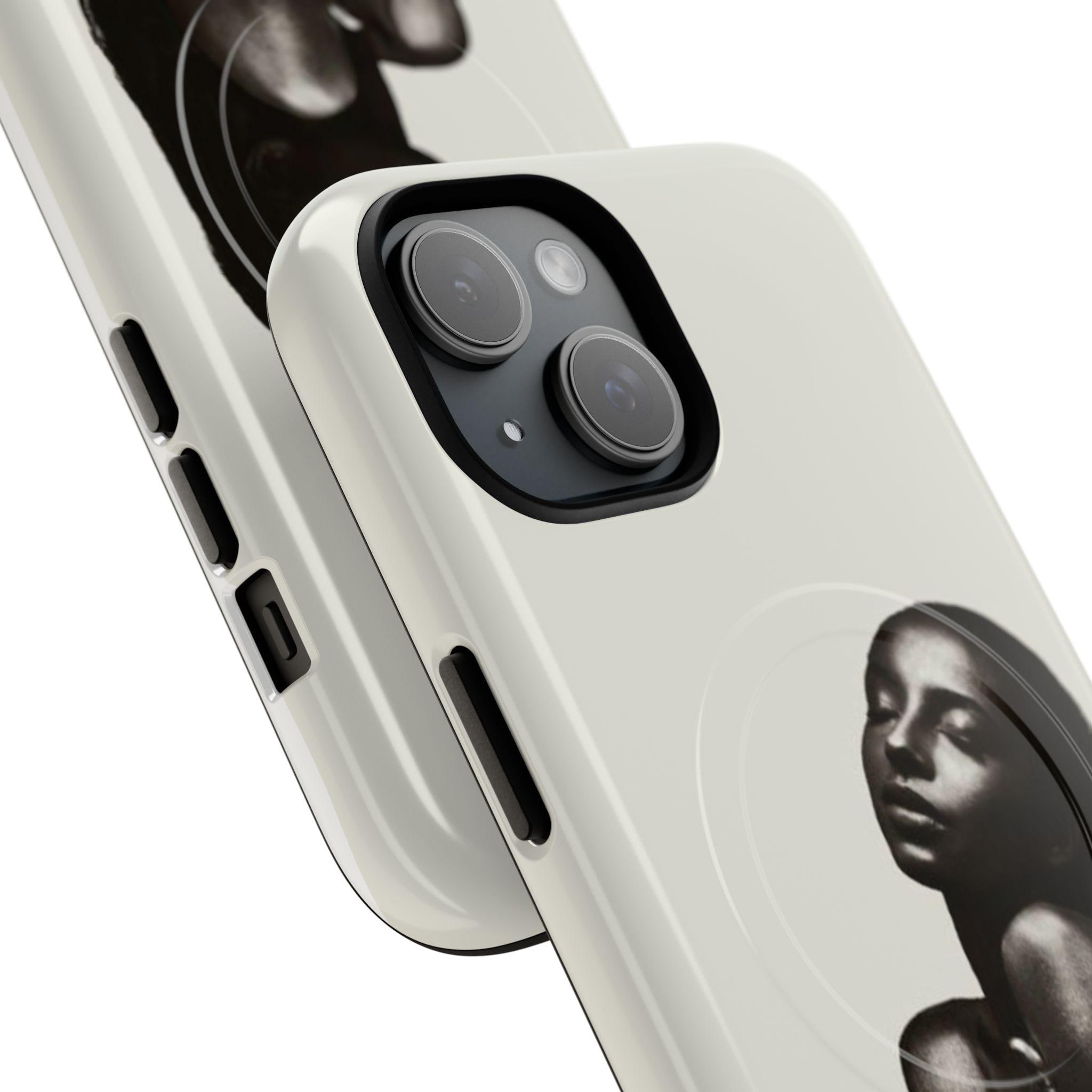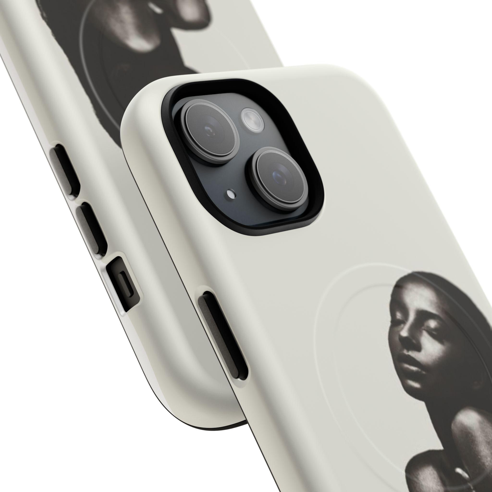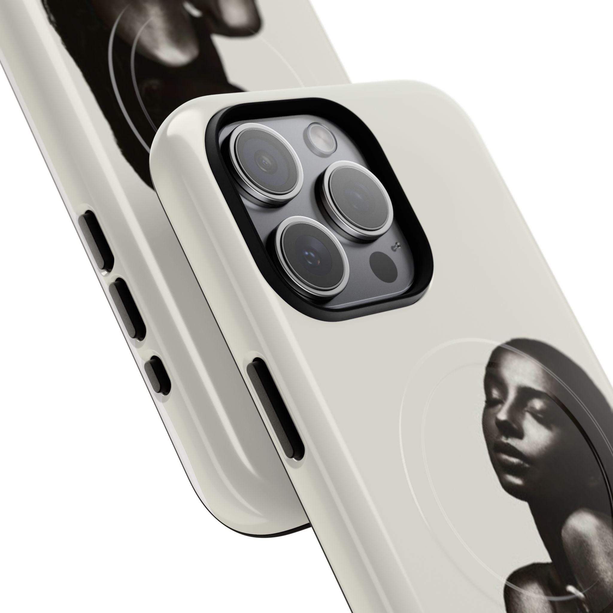 This slim, dual-layer phone case wraps your device in quiet confidence. A soft-touch silicone liner cushions every drop while the rigid polycarbonate shell shows off a monochrome portrait that reads like a moment captured in film — luminous highlights, deep shadows, and an intimate pose that draws the eye. The embedded magnetic module is MagSafe® compatible so the case works with chargers and accessories without losing its sleek profile. Finished in your choice of glossy or matte, with clear ports and precise cutouts, it’s made to live in your hands and travel with you.